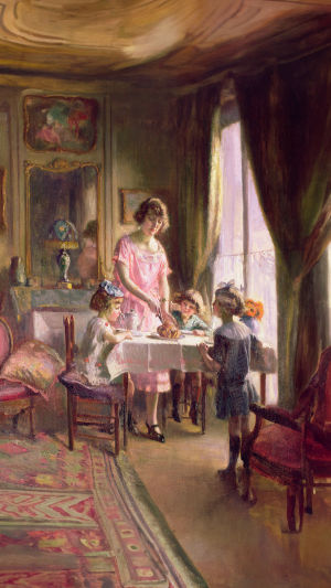 At first sight, the composition feels familiar. A group of children gather around a table set for tea. There is no grand gesture, no dramatic lighting, no theatrical movement. Instead, Silbert arranges the figures so that the viewer's eye moves slowly from face to face, from hands to cups, from fabric to tabletop.