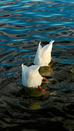Ducks often tip forward with their heads submerged, leaving tails in the air. This dabbling method allows them to reach algae, seeds, and small insects floating near the water surface. For example, a mallard can skim several centimeters below the surface to catch tiny plant matter without fully diving, conserving energy.