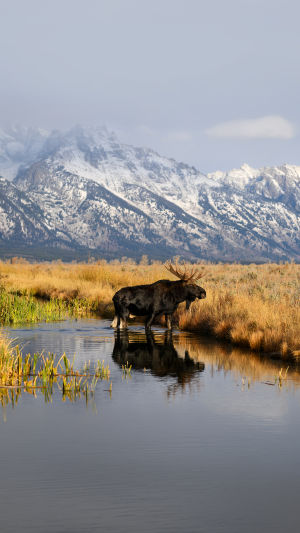 The moose in this shot is a bull — you can tell by those broad, palm-shaped antlers. A professional guide who has spent over a decade working in Grand Teton describes moose as animals that find a spot they like and stick to it, with relatively small migration routes. They're creatures of habit, and that's actually good news for visitors. The golden grasses, still water, and towering Teton Range in the background? That's basically their living room. Moose are especially common near ponds and lakes, as well as along the park's rivers, which makes Grand Teton one of the most reliable places in the country to spot them.