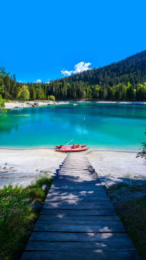 You're standing on a wooden dock in the middle of a Swiss pine forest, staring at water so vivid and turquoise it looks like someone swapped out the lake overnight with a Caribbean lagoon. A red rowboat bobs gently by the shore. The trees are perfectly reflected on the surface. And you're thinking — there's no way this is natural.